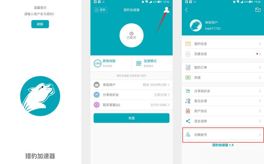 切换号账户后,可以在首屏界面里显示个人信息,包括你的剩余时间以及加速模式。启用账号前,需要选择链接线路,注意选择VIP线路,不要跟普通用户挤到一条线路去,以免影响使用体验