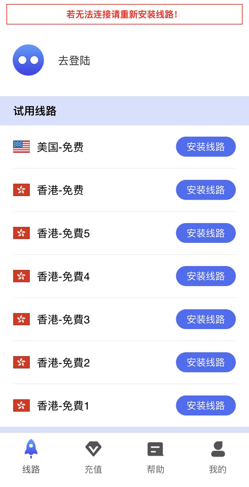 在客户端输入刚注册好的账号和密码进行登录,登录后用户的账户都是普通账户,每个新用户都会赠送免费的线路,在线路切换选项处可以看到免费线路。