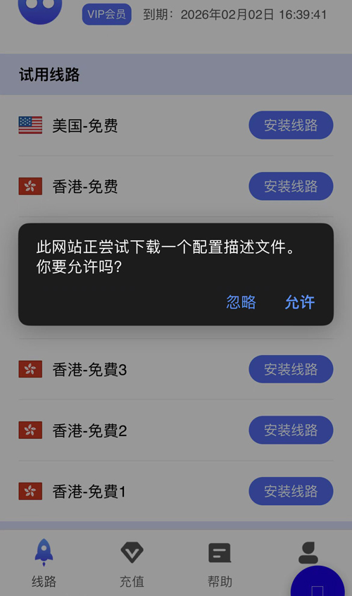 7,登陆成功之后,我们点击首页线路右侧的“安装线路”,在弹出框中选把选择“允许”,如下: