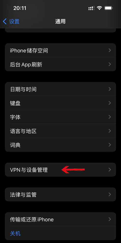 8,此刻配置文件已经下载下来,我们返回苹果手机找到 设置 - 通用 -VPN与设备管理,点击“VPN与设备管理”如下:
