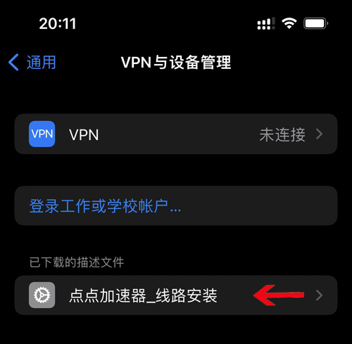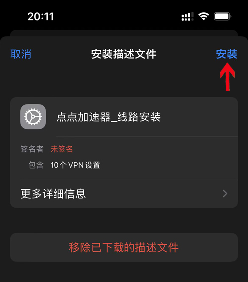 9,我们会看到已下载的描述文件点点加速器线路_安装,我们点击“点点加速器_线路安装”,如下: